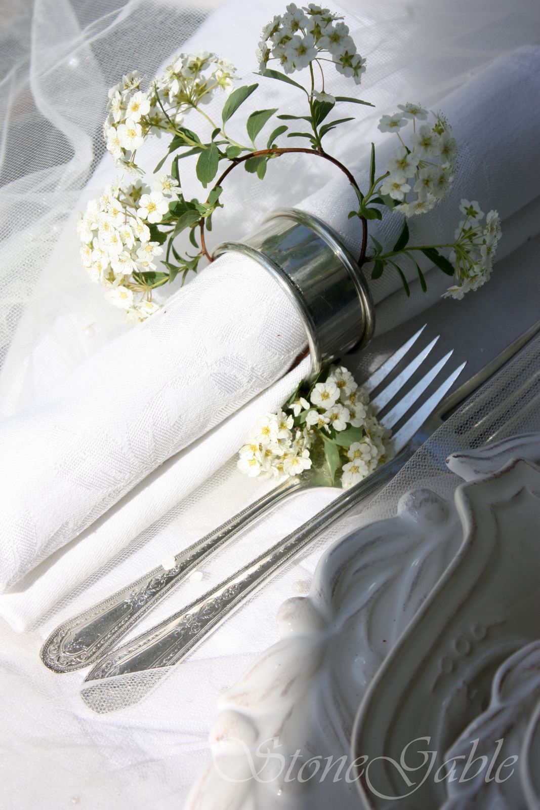 White damask napkins are rolled and held in place by a wedding band-like sterling silver napkin ring. A tender branch of bridal veil is intertwined around the napkin ring.