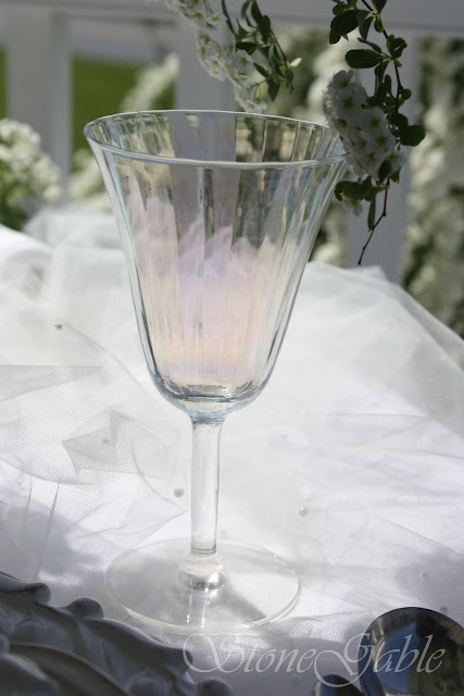 My grandmother's wedding goblets are like honored guest at this table. The sun catches their slight iridescence and makes them blush like the cheeks of a bride!